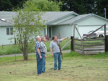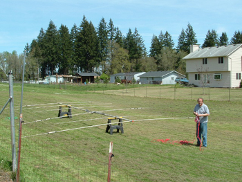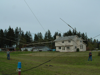 | The first thing you need is a good crew. Here are (L-R) W7VO, KD7JET, W7OR, and AC8MJ. My neighbor Bruce (at the back) offered his tractor to help with lifting the antenna. Not pictured is K0JJ and WH6KO, who did the photography. | The second thing is to drape 200 foot long lines over the ends of the antenna. They are draped over so they can be easily pulled loose once the antenna is installed on the mast. These lines will be used to guide the antenna and keep it level as it goes up. A third line is attached in the middle to help pull the antenna away from the guy wires |