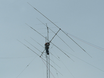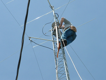 Damn, this sucker is heavy! You really need two people at the top of the tower to wrestle the 75 lb antenna into position and bolt it to the mast |