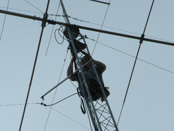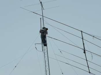 Here I am, installing the gin pole on the tower. Our first attempt failed because of the 2 inch exhaust tubing used for the gin pole, which bent like a pretzel under the weight of the TH6. WH6KO had some heavy 2 inch galvanized pipe, which worked much better |